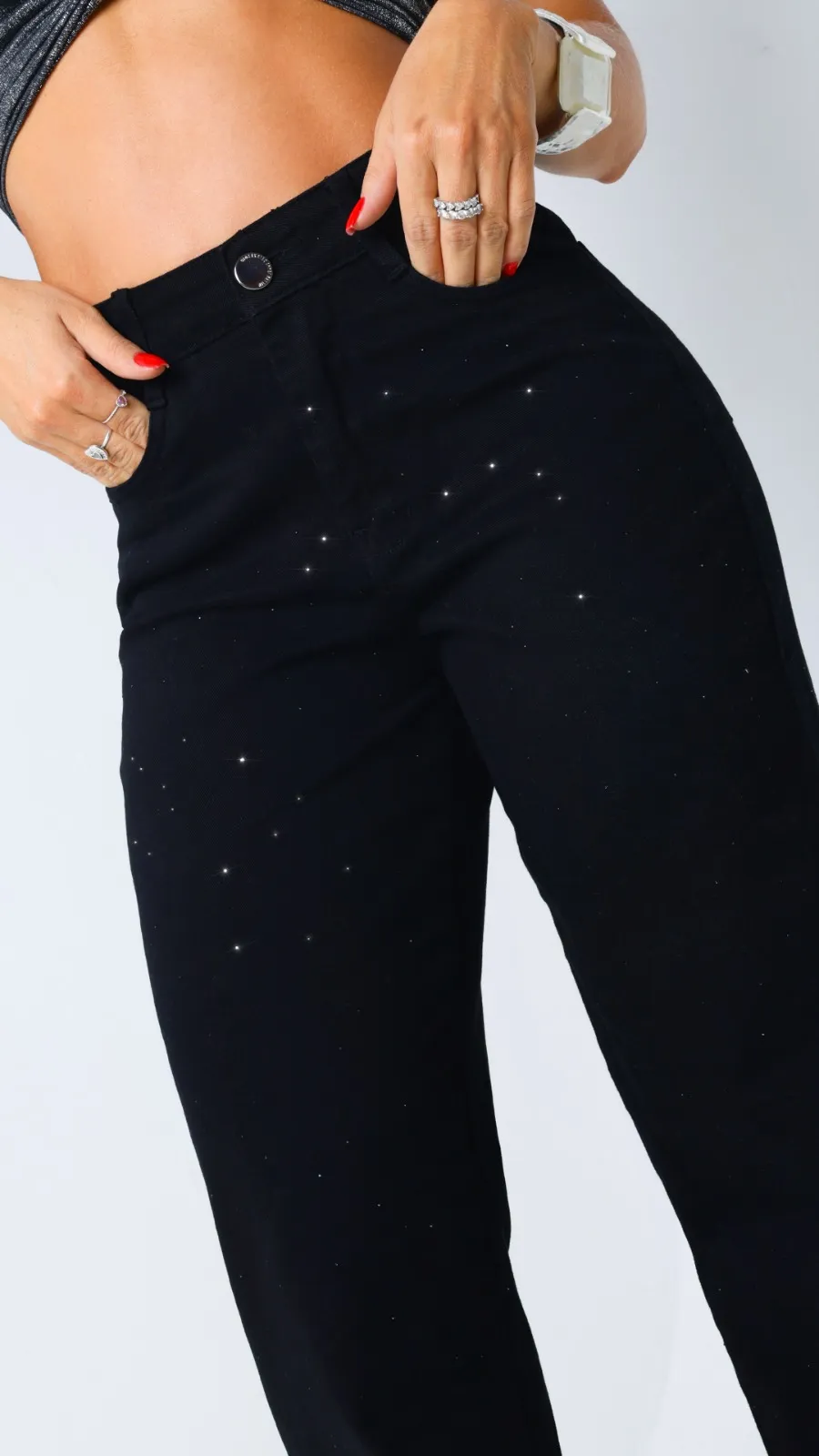 Detalhes que fazem diferença: acabamento com pedrinhas delicadas espalhadas pelo jeans, dando um toque glam sem exageros. Ideal para compor looks casuais ou produções mais fashion com cropped, body ou camisa estilosa.